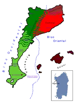 | 区域 | 加泰罗尼亚、巴伦西亚、巴利阿里群岛、鲁西永、阿拉贡、穆尔西亚、撒丁島(阿尔盖罗)、安道尔 |