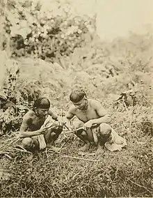 兩名生火中的婆羅洲土著,取自查爾斯·霍斯1912年出版的著作。他稱其為「加里曼丹族」,並標記:「加里曼丹族透過摩擦竹片在叢林中生火。」[1]