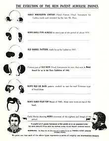 在19世纪末,隐形助听设备变得越来越流行。雷恩首创了许多著名的设计,比如他的“助听发带(acoustic headbands)”,被称为“Aurolese Phone”,这种助听装置可以巧妙地隐藏在头发或帽子里。雷恩的“Aurolese Phone”发带形状各异,它们在耳朵附近收集声音,可以放大音响效果。这些隐形的助听设备也常常被藏在沙发、衣服或者随便什么配件里。这些不断增加的隐形能力的方式,往往更多的是将个人的残疾隐藏起来,而不是帮助残障人士解决自己的问题。[3]