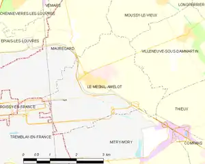 与勒梅尼勒阿姆洛接壤的市镇(或旧市镇、城区)包括:旧穆西、蒂约、法兰西地区特朗布莱、莫尔加、米特里-莫里[2]。