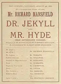 剧作经过两周多排練就于1887年5月9日在波士顿博物馆首演,是史蒂文森原著的首版美国改编[10][注 1],5月14日作品停演改写剧本[12]。同年9月12日,阿尔伯特·马什曼·帕尔默制作的新版在百老汇麦迪逊广场剧院开演,沙利文邀请同年夏季迁居美国的史蒂文森,史蒂文森因病未出席,夫人和母亲代他前来向沙利文道贺[13][14]。麦迪逊广场剧院版10月1日停演,曼斯菲尔德率旗下公司开始全国巡演[15],第一站是費城栗树街剧院[16],随后巡回十多个城市,其间多次返回波士顿或纽约演出[17]。1888年6月29日,《化身博士》返回麦迪逊广场剧场完成季终日场演出[18]。