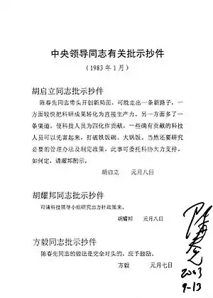 1983年1月7日,曾经担任过中科院院长的国务院副总理方毅批示:“陈春先同志的做法是完全对头的,应予鼓励。”8日,主管科教工作的中央书记处书记胡启立批示:“陈春先同志带头开创新局面,可能走出一条新路子。一方面较快地把科研成果转化为直接的生产力。另一方面多了一条渠道,使科技人员为四化做贡献。一些确有贡献的科技人员可以先富起来,打破铁饭碗,大锅饭。当然还要研究必要的管理办法及制定政策,此事委托科协大力支持。如何定,请耀邦酌示。”中共中央总书记胡耀邦当天批示:“可请科技领导小组研究出方针政策来。”13日,国家科委副主任赵东宛批转“请明瑜同志阅,在我们制定制度和政策时可按胡耀邦同志和胡启立同志指示精神把陈春先同志的意见考虑进去。”