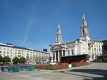 这是一个L形的步行和活动区,在一个朝南的斜坡上,从利兹市民厅向下,西到卡尔弗利街,另一边是利兹总医院的布拉泽顿楼。