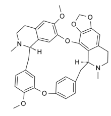 千金藤素(英語:)是从台湾千金藤分离的消炎抗肿瘤化合物[1],获实验室研究证明有效对抗人类嗜T细胞病毒[2],也能治疗辐射诱发的白细胞减少症、特发性血小板减少性紫癜、圓禿、糠性秃、毒蛇咬伤、口干、结节病、顽固性贫血及多种与癌症相关的疾病。该药在CEP检测下无安全问题,副作用甚少报告[3]。