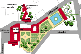 ![]() 华伦斯坦宫的东立面以及华伦斯坦花园的一部分,背景是布拉格城堡 | |