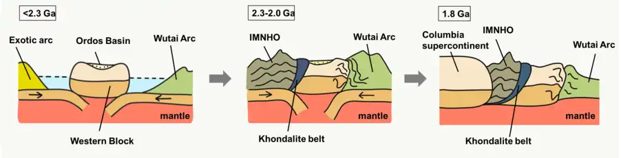 Kusky模型中,[5][40]古陆块在35-27亿年前形成了年轻的西部陆块。23亿年前,五台弧和一个外来弧分别潜没到西部地块的东西两侧。23-20亿年前,西部地块与这两个弧相撞,东南部形成了恒山花岗岩带,西北部则形成内蒙古-河北北部造山带和孔兹岩带。最终,哥伦比亚超大陆在18亿年前的华北克拉通北缘与之发生碰撞。