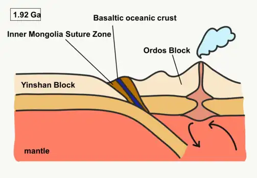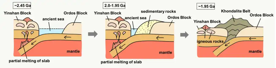 赵国春模型[1][3][4]可以分为两个主要阶段:新太古代地壳增生和古元古代两个地块的融合。赵国春等人提出,27亿年前,年轻的阴山地块发生过一次大型地壳增生,形成厚厚的镁铁质地壳,尽管还不能确定这一岩浆事件是发生在大陆还是海洋环境中。25.5-25亿年前,年轻的阴山地块被部分熔化,产生大量TTG岩石,覆盖了整个阴山地块。约24.5亿年前,鄂尔多斯地块潜没到阴山地块下。俯冲板块的部分熔化形成了花岗岩和喷出岩,如埃达克岩和赞岐岩类。20-19.5亿年前,鄂尔多斯地块北部的沉积岩沉积在稳定的大陆被动边缘。西部地块的最终形成发生于约19.5亿年前。阴山地块南部和鄂尔多斯地块北部相撞时,古海洋关闭。陆陆碰撞的高温高压环境产生了两个地块间的孔兹岩带,使得西部地块其他部分发生变质作用。[1][3][4]