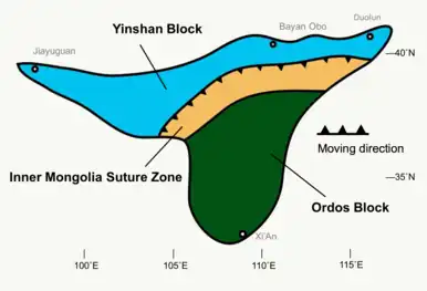 Kusky等人[5][40]则将西部地块分为3个部分:内蒙古-河北北部造山带、恒山高原和一个微陆块。恒山高原南界是一个正断层,方向为东东北-西西南。东北-西南走向的大同-吴起断层横贯西部地块。