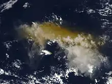 2005年11月卡尔塔拉火山喷发之后的卫星图。图中可见,喷出的火山灰遮住了大科摩罗岛(图中以线标出其轮廓)及其它岛屿