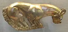 距离现在更近(大约 40,000 至 10,000 年前)的艺术包括石洞壁画,例如肖维岩洞、 阿尔塔米拉洞、Pech Merle、Arcy-sur-Cure 和拉斯科洞窟中的壁画作品,以及一些小型艺术品,例如维伦多夫人像等人物或动物雕刻品、 Les Eyzies 狼吊坠以及一些被称为孔杵(bâtons de commandement)的物品。