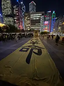 8月5日大罷工當日市民在雨傘運動的金鐘夏慤道的行人天橋上懸掛一幅白底黑字寫著「Liberate Hong Kong, revolution of our times 光復香港 時代革命」的直幡[27][28] 。