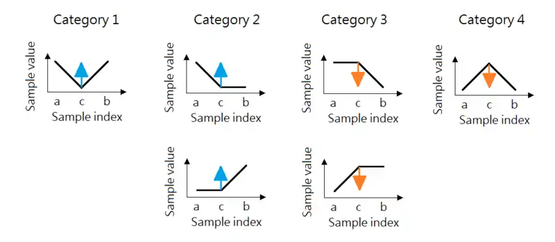 對於一個給定的邊緣偏移類(Class),在編碼樹區塊內的每個樣本會被分為5種形態(Category)中的其一,當前樣本"a"會根據選擇的一維方向模式和兩相鄰樣本"b"、"c"比較,比較的規則如下表: