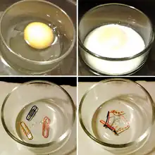 (上图) 在煮熟鸡蛋的时候,在蛋清中的蛋白质白蛋白发生变性和溶解性的损失。(下图) 回形针提供一个可视化的类比来帮助概念化变性的过程。