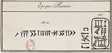 大约在这段时间,商博良又取得了突破。[84]尽管他统计了大约860个象形文字符号,但这些符号中有少数在所有文本中都占很大比例。他还偶然发现了雷暮沙最近对中文进行的一项研究,研究表明即使是中文书写也广泛使用了表音字符,表意字符也必须组合成许多连字才能形成完整的词汇。很少有象形文字是连字。商博良已经辨认出安提諾烏斯的名字,他是一个非皇室的罗马人,没有象形繭,周围的字符似乎是表意的。因此,表音字符不仅仅限于象形繭。为了验证他的怀疑,商博良比较了象形文字中看上去包含相同内容的文本,并指出拼写上的差异,表明了同音词的存在。他将得到的同音词列表与他通过象形繭得到的语音符号表进行比较后发现二者并无差异。[85]