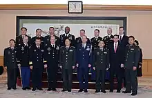 史達偉准將(前排右起第四位)於美國駐華武官任內,偕同美軍人道主義救援减災代表團團長史蒂芬·里昂斯少將和中央軍委聯合參謀部副參謀長戚建國中將合影,2012年
