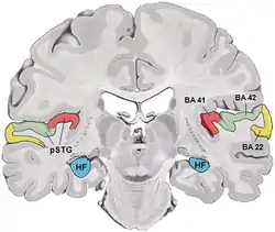 ![]() 主要听觉皮层以粉红色突出显示,并与上述突出显示的其他区域相互作用 | |