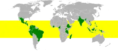 咖啡帶的圖示(黃色),綠色的部分是前二十個最大的咖啡生產地區。