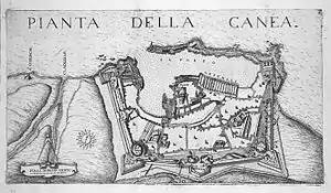 1645年6月23日,克里特战争爆发,奥斯曼军队围困哈尼亚56天后,在8月22日突破西南城墙,占领哈尼亚。[3][4] 奥斯曼帝国统治哈尼亚直到1898年11月[2]。20世纪初,南侧城墙被克里特国拆除。