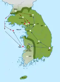 7世纪初,新罗从百济攻占到在550年之前被高句丽占领的汉江流域后,疆域抵达黄海。新罗开始与唐朝结盟共同对付百济和高句丽。[5][6][7]660年新罗联合唐朝攻灭百济,668年又攻灭长期统治朝鲜半岛北部的高句丽。灭亡高句丽后,唐朝在朝鲜半岛设置安东都护府作为统治机构,并最终导致唐罗战争。[7]