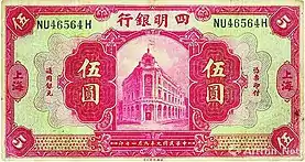 四明银行在1921年发行的伍圆券,其上印有四明大楼