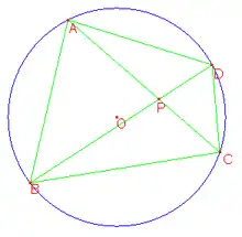 凸四边形的两条对角线将自身分成四个三角形。如果这个四边形是圆内接四边形,那么相对的两个三角形是相似的。如右图中,是圆内接四边形的两对角线交点,则,。一个与此等价的说法是所谓的相交弦定理:设凸的圆内接四边形的两条对角线相交于一点(图中的),那么其中一条对角线被点所分成的两段的长度之乘积等于另一条对角线被点所分成的两段的长度之乘积:。相应的逆命题也成立:如果一个四边形ABCD的两条对角线交于点,且(或,或),那么四边形是圆内接四边形。