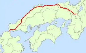 - 重要經過地:龜岡市、京都府南丹市(舊船井郡八木町、同郡園部町)、船井郡京丹波町(丹波町、瑞穂町)、福知山市、兵庫縣朝來市(舊朝來郡山東町、同郡和田山町)、養父市(舊養父郡八鹿町)、同縣美方郡香美町(舊村岡町)、鳥取縣岩美郡岩美町、鳥取市、同縣東伯郡湯梨濱町、同郡北榮町、米子市、安來市、松江市(西津田三丁目)、島根縣八束郡宍道町、出雲市、大田市、江津市、濱田市、益田市、同縣鹿足郡津和野町、山口縣山口市、宇部市(吉見)、山陽小野田市