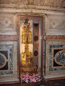 最后在18世纪,整个石棺被放在大理石祭坛上。在在坟墓后面的小堂,有放置圣多明我头颅的黄金圣物箱,是雅科波·罗斯托·达·博洛尼亚(1383年)的杰作。