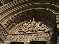 由于历史上深受古罗马文明影响,十二世纪普罗旺斯地区的罗曼式建筑深深烙上了古典艺术的印迹,圣托菲姆教堂西立面大门的三角门楣即是这一传承最优秀的代表之一,三角门楣双坡同侧廊及中厅坡顶平行呼应,强化了整个西立面的水平走向。在这里,门楣作为建筑要素的功能已弱化,而更多是作为装饰要素来处理的。