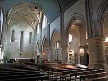 教堂呈矩形,西立面有钟楼-墙,前面有门廊。[8].咏经席是典型的哥特式风格,雕刻装饰华丽。罗马式小堂的元素仍可在后殿和西立面的钟楼-墙看到。[6]