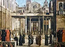 自1369年以来,圣若望大会堂以拥有一块真十字架而著称,为其带来大量财富[3]。会堂内拥有许多威尼斯著名艺术家关于“真十字架的奇迹”的作品。1797年拿破仑征服威尼斯共和国,取缔会堂,这些艺术品收藏在学院美术馆。现在圣若望大会堂仅在有限的日期内向游客开放[4]。