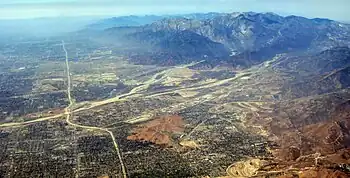 圣安德烈亚斯断层和圣哈辛托断层带分别沿圣贝纳迪诺山脉和圣哈辛托山脉进入山谷。两条断层线在圣贝纳迪诺市收敛到小于10千米,而在盆地西北部的卡洪山口附近甚至不到 3公里。 [9] [11]