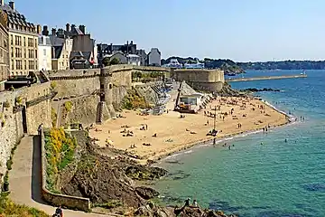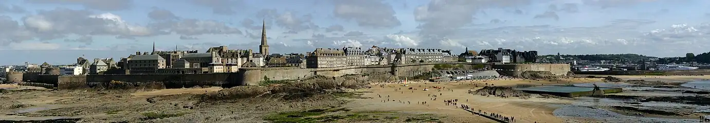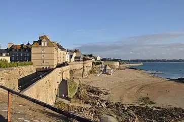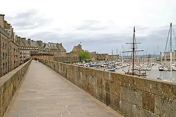 圣马洛 城墙的建造始于1144年。[1]1708年至1742年间,四分之三的城墙由军事工程师西梅翁•加朗若(Siméon Garangeau)重建,他扩建了城市,修复了南部和东部的大部分围墙(使其总长度达到1754米),并使城内面积达到16至24公顷, [2][3]。