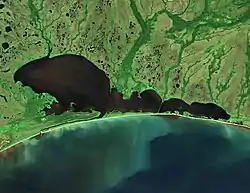 多来加湖位于特米-幌内低地中,接近幌内川河口。北面是奥库托沼泽,南面隔狭窄的沙嘴与多来加湾相望。湖水东部较咸、浅约半米,西部淡、深约一米多。