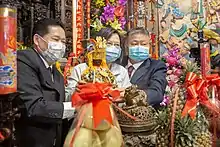 ![]() 2021年大甲媽祖遶境上轎典禮,由中華民國總統蔡英文與財團法人大甲鎮瀾宮董事長顏清標、副董事長鄭銘坤進行 | |