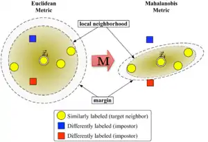 大间隔最近邻居算法的主要想法就是通过学习一种距离度量使得在一个新的转换空间中,对于一个输入 的个近邻都属于同一类别,而不同类别的样本与保持一定大的距离。如果该想法能够实现则留一(LOO)分类错误率将会最小化。该算法的最主要的任务就是求得满足条件的线性空间转换矩阵。 定义有类别标签的训练数据集为:, 其中类别标签集为:. 我们的目标是学习一种用来估计如下平方距离的线性变换: