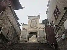 山门后面西方是一个长方形的庭院,南面围墙建在悬崖之上。小院北侧依山势砌筑,有宽40米,高3米的高台,一条长排宽石阶梯正中有垂带两条,垂带中间有浮雕“龙凤呈祥”等图案,浮雕现在已经损毁。