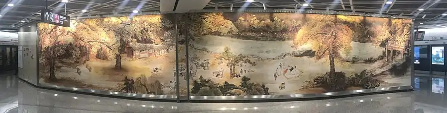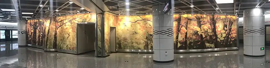 设置于地下二层3号线与10号线岛式站台北侧,以公园的秋日景色,展现成都的市井文化。