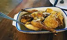 鸡肉的两面都被炸过,然后在有盖的锅里用小火煮20-25分钟。完成后将其放在盘子里,从锅中加入少量的油;大蒜和坚果与水一起在剩余的油中炖煮。5分钟后,将鸡肉加入这种混合物中,并在食用前加热。
