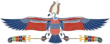 ![]() 奈赫貝特的圖像,為一隻頭戴阿特夫冠,腳抓繩環和羽毛權杖的展翅禿鷹 | |||||||
