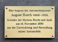第一輛霍希汽車於1901年正式出廠。該公司於分別於1902年遷廠至福格特蘭地區賴興巴赫和1904年遷至茨維考。霍希於1909年因為一次嚴重糾紛而離開了公司,並在茨維考成立了另一家競爭公司。他的新公司最初命名為 Horch Automobil-Werke GmbH,但法院裁定 Horch 品牌名稱是霍希的前合夥人公司的註冊商標,霍希不再有權使用它,所以在這場法律訴訟之後,他決定成立另一家汽車公司。霍希(Horch)於1910年將他的新公司命名為奧迪汽車有限公司(Audi Automobilwerke GmbH),奧迪是霍希的拉丁語。