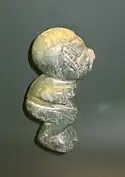 另一種奥尔梅克雕像是類似矮人或胎兒,如左圖,特徵是小鼻子、橢圓形頭部、蹲伏姿態。一些研究人員,如米格爾·科瓦魯維亞斯(Miguel Covarrubias)將這些雕像稱作矮人(dwarfs)[28],許多研究人員包括瓦魯比亞斯認為是產前的姿勢。[29]