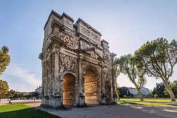 - The traditional dating for the triumphal arches of Gallia Narbonensis is summarized in Pierre Gros, "Pour une chronologie des arcs de triomphe de Gaule narbonnaise", Gallia 37(1979:55-83
