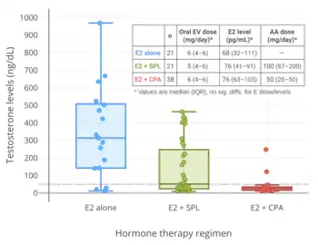 除了产生女性化外,雌激素还具有抗促性腺激素作用,抑制性腺产生性激素[51][49][59]。雌激素主要负责抑制跨性别女性的睾酮水平[51][59]。雌二醇水平在200 pg/mL及以上,可抑制睾酮水平约90%,而雌二醇水平在500 pg/mL及以上,可抑制睾酮水平约95%,或达到与睾丸切除术和GnRH调节剂相当的程度[60][61]。较低的雌二醇水平也可以显著抑制睾酮的产生,但不完全[49]。当单独的雌二醇不足以抑制睾酮水平时,可以使用抗雄激素来抑制或阻断残留睾酮的作用[51]。口服雌二醇往往难以充分抑制睾酮水平,因为所产生的雌二醇水平相对较低[49][62][63]。