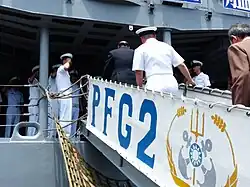 2014年左營軍港營區開放活動,東二號碼頭開放參觀的成功型巡防艦子儀(PFG2-1107)左後方。