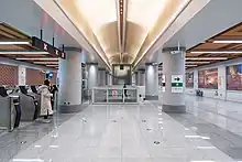 本站站厅付费区布设有题为《青春校园》的艺术墙,展现了图书馆、篮球场、自习室、宿舍、实验室等大学生活场景[5]。