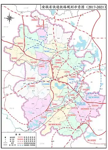 - 合安九客运专线:为京港高速铁路的组成部分,连接安徽省合肥市与江西省九江市的客运专线,全线分为合肥-安庆段和安庆-九江段两段铁路工程进行建设,合安段于2020年12月22日开通运营,铁路系统称为京港高速线合安段,设计时速为350公里/小时。