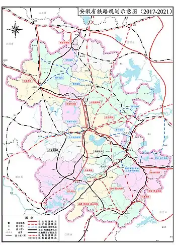 安徽铁路,是在中国安徽省境内的铁路网系统。安徽省境内最早的铁路是宿州至滁州段的津浦铁路。省内最早修建的铁路是于1934年由淮南至裕溪口的淮南铁路,其于1936年1月建成通车;经过数十年的发展,截至2019年,全省铁路运营总里程达到4445公里,以合肥为中心、以高速铁路为主要骨架的现代化铁路网正在加快形成之中[4][5][6][7]。