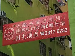 田生集團以鋪天蓋地的紅底白字標語橫額及其標誌等方式收購樓宇,曾引起社會關注。2010年10月19日,「八十後反地霸青年」成員到九龍城田生地產門外示威,指田生以張貼巨型標語等方式迫使業主出售單位,並認為此等行為毫無道德。[9][10] 田生集團之目標樓宇時常出現各種治安問題,如單位無故斷水斷電、鄰近空置單位無故起火,或遭潑屎水等。而同區其他樓宇卻無這些問題。[10][11]