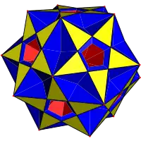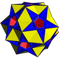 大複雜斜方截半二十面體,互相相交的藍色正方形以中間透明的方式使內部的互相相交紅色五邊形可以被觀察到。