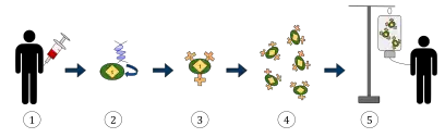 不论血液来源,接下来都会通过血细胞分离器进行白细胞分离,并从中收集外周血单个核细胞[19][20] 。这些产物将随后被转移至细胞处理中心。在此,特定的T细胞会被细胞因子白介素2(IL-2),抗CD3/CD28抗体,抗CD3抗体等物刺激,以便其能迅速增殖[21] [20]。